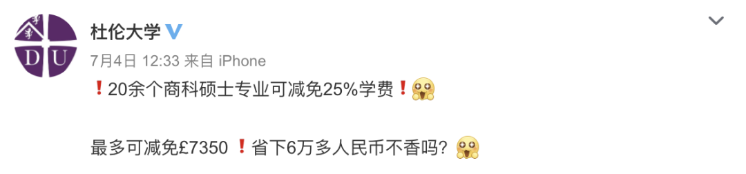 今年7月,杜伦大学曾为今年9月入学的留学生提供20余个商科硕士专业25%的学费减免!