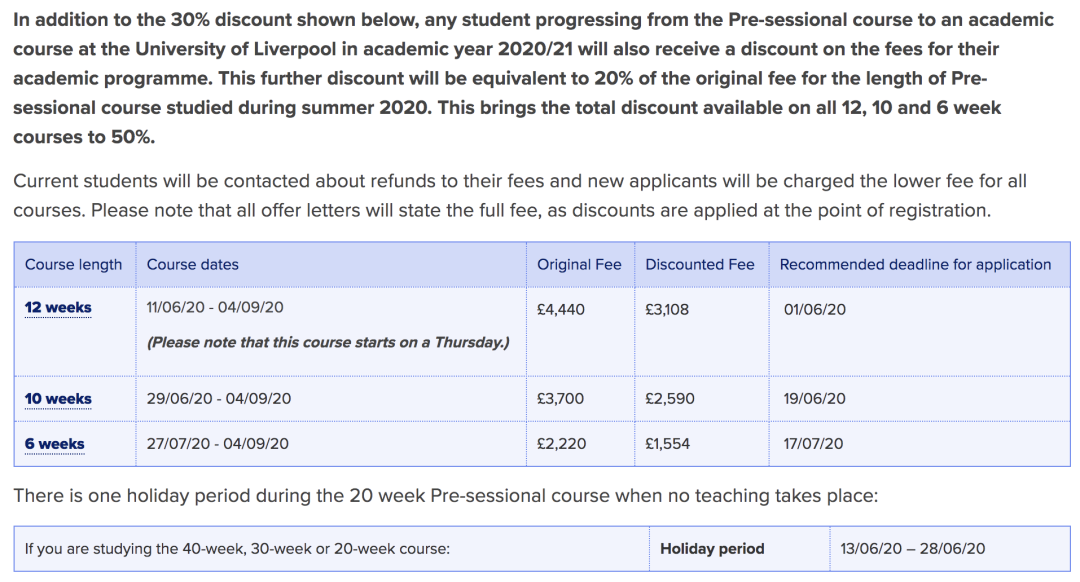 利物浦大学曾为所有参加6周、10周和12周语言班的留学生减免50%的语言班学费。